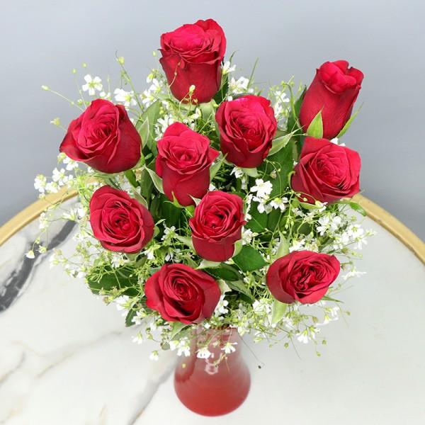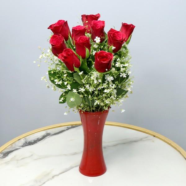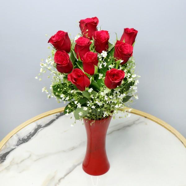 Fall in Love all over again with our newly discovered Artistry of Roses. This Bouquet is designed to send the message of love which is pure, innocent and magical.This floral arrangement includes 10 Red Roses in a Vase.