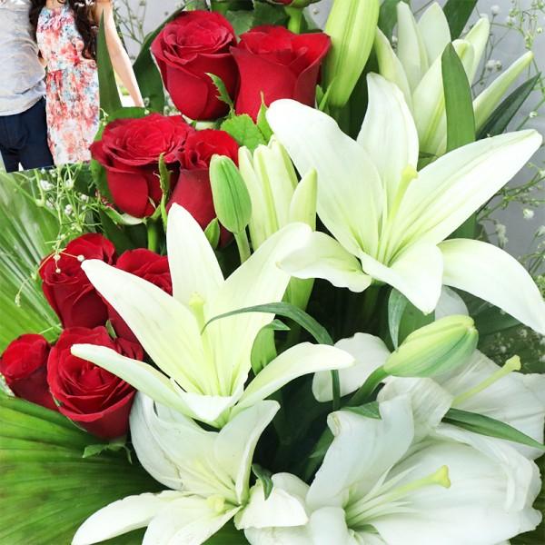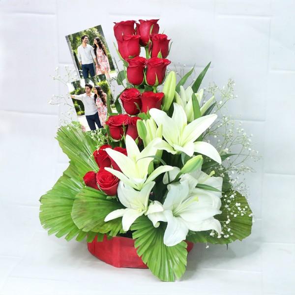 If you want to sweep someone off of their feet, present them this beautiful flower arrangement. With arrangement of 2 white lilies, 14 red roses with 2 personalised photos, it sure is a special one.