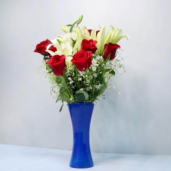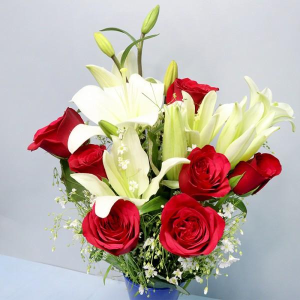 While Red gives you the boost of passion, White helps in maintaining the balance. This unique combination of these two colours make this bunch of flowers perfect. This bunch has 7 Red Roses and 3 White Asiatic Lilies, wrapped in Premium MFT Glass Vase.
