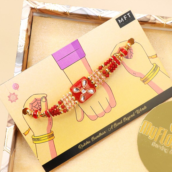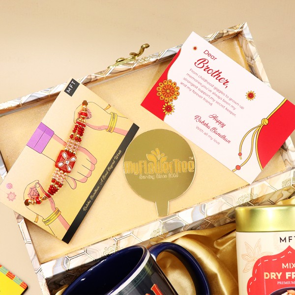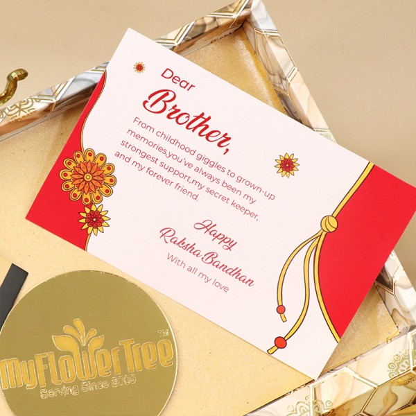Send your love across with this traditional Rakhi hamper, complete with a sacred rakhi thread, delectable goodies, and a touch of festivity in every detail. A timeless expression of sibling affection.