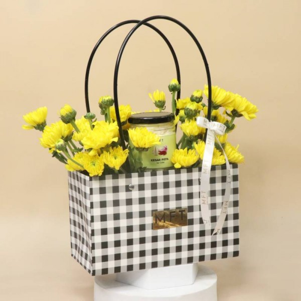 Brighten someone's day with our Sweet Bloom Bag, a premium gift set that combines the natural beauty of fresh Daisy flowers with the irresistible taste of a handcrafted Kesar Pista Vanilla jar cake. Thoughtfully packed in an elegant gift bag, this combo is perfect for birthdays, anniversaries, thank-you gifts, or just because.The cheerful daisies add a touch of freshness and positivity, while the rich, layered jar cake satisfies every sweet craving. It’s a heartwarming way to say “you matter” with both blooms and bites.