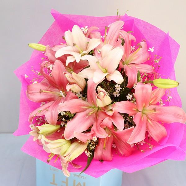 - 5 Dark Pink Oriental Lilies in Pink Paper Packing