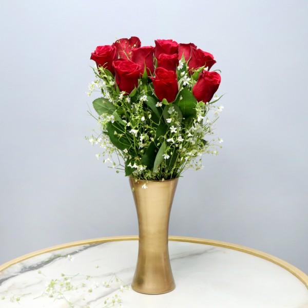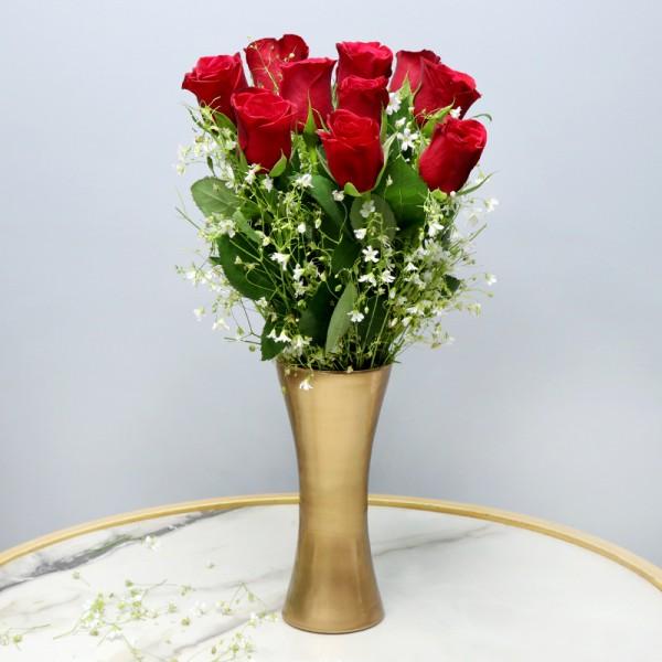 Celebrate elegance and affection with this stunning arrangement of 10 hand-picked red roses, beautifully set in a luxurious golden MFT glass vase. The fresh, delicate blooms exude charm and tenderness, making it a graceful gift for someone truly special.