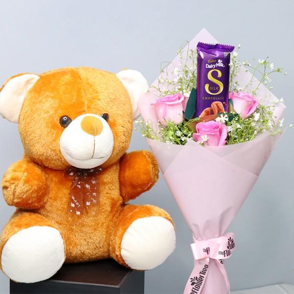 Embrace enchantment with our Lavender Rose Elegance Bouquet with Teddy. The soothing tones of lavender roses in this arrangement radiate a sense of calm and admiration, making it a perfect gesture of love and appreciation.