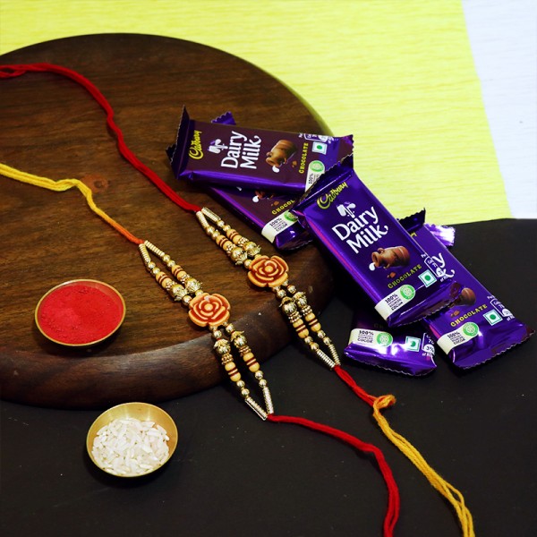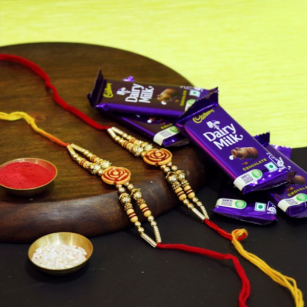 This delectable delicacy will mark its presence in every corner of the home with a beautiful combo of 2 Designer Rakhi and 5 Dairy Milk Chocolate. Order Now!
