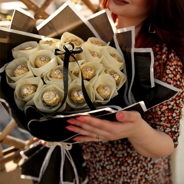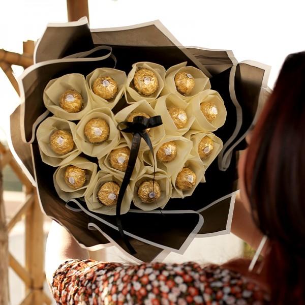 For someone who has a sweet tooth, this Chocolate bouquet would be a perfect gift. It has 16 pieces of Ferrero Rocher Chocolates assembled together using red and pink paper packing.