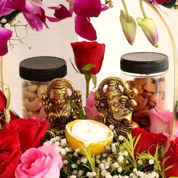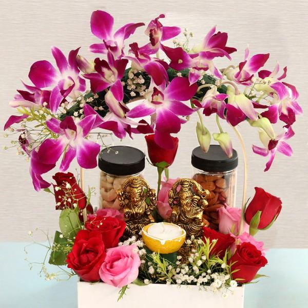 Send festive wishes to your friends and family with premium deliciousness in this wholesome hamper. The reusable gift box is filled with orchids, roses, almonds, cashews, and antique laxmi ganesha with Diya. The box is an awesome festive gift hamper that is available for delivery in Delhi- NCR.