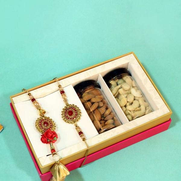 A colourful surprise awaits for your dear bhaiya and bhabhi this Raksha Bandhan. So, send their way this beautiful golden signature box full of surprises. It has a gorgeous Peacock bhaiya-bhabhi rakhi set, a jar of chocolate cookies, and mixed dry fruits each. Also, it has a pack of roli, chawal, mishri, and elaichi to help you celebrate it auspiciously.