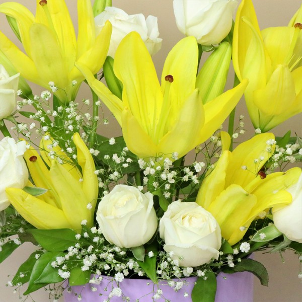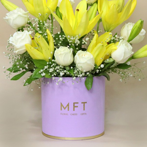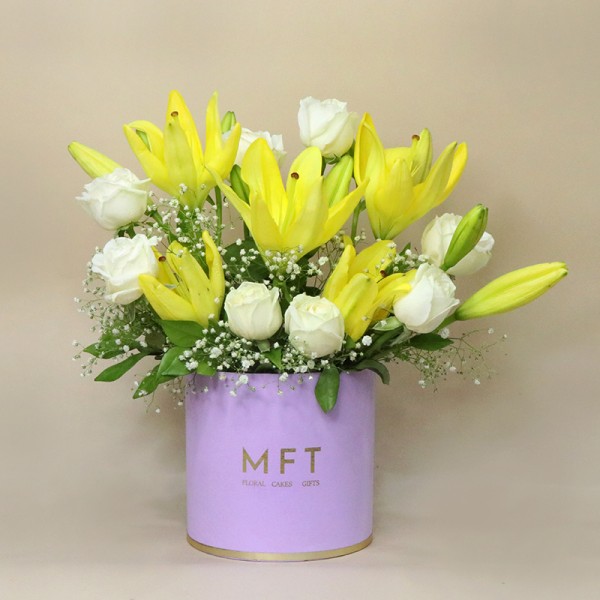 Enhance any space with the Elegant Harmony Rose & Lily Arrangement in MFT Lilac Box. This exquisite bouquet features 8 pristine White Roses and 5 vibrant Yellow Asiatic Lilies, elegantly arranged in a premium MFT round lilac box. Ideal for weddings, anniversaries, or special occasions, this sophisticated floral combo combines the purity of white roses with the brightness of yellow lilies for a stunning visual impact.