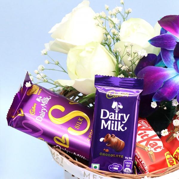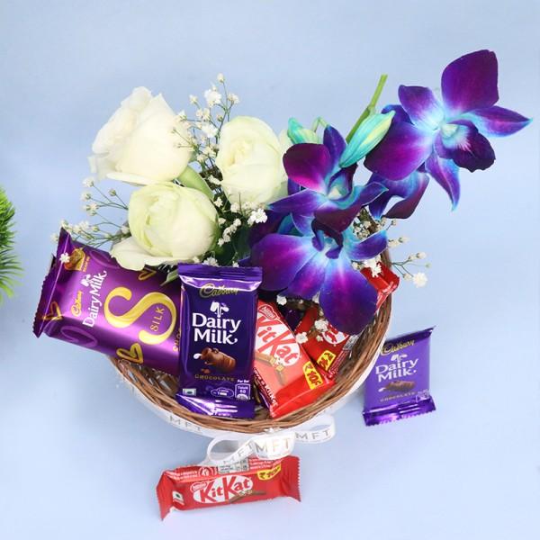 Make a lasting impression with the White Roses and Blue Orchid Combo – an enchanting blend of elegance and charm. This stunning arrangement combines the timeless beauty of pristine white roses, symbolizing purity, respect, and new beginnings, with the exotic allure of blue orchids, representing strength, beauty, and uniqueness. Together, they create a breathtaking bouquet that exudes grace and sophistication.Perfect for special occasions like weddings, anniversaries, or as a thoughtful gesture to convey admiration and heartfelt emotions, this combo is designed to elevate any celebration. Paired with delicious chocolates, it makes for an unforgettable gift.