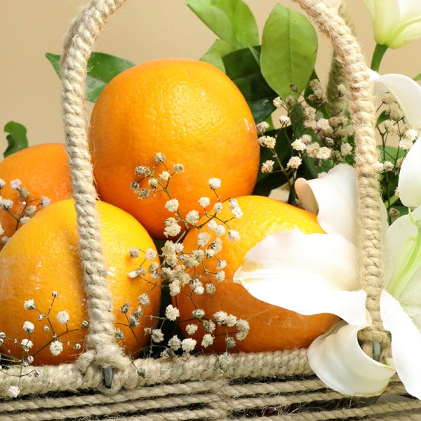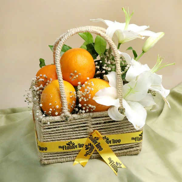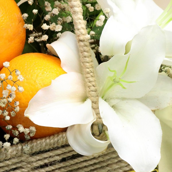 The Premium Fruit Hamper Basket features approximately 2 kg of the finest, juiciest oranges or Malta, complemented by the elegance of fresh white lilies. This luxurious combination offers a refreshing, sweet citrus experience paired with the timeless beauty and fragrance of lilies—an ideal gift for those who appreciate nature’s finest offerings. Perfect for any occasion, it’s a symbol of purity, freshness, and sophistication.