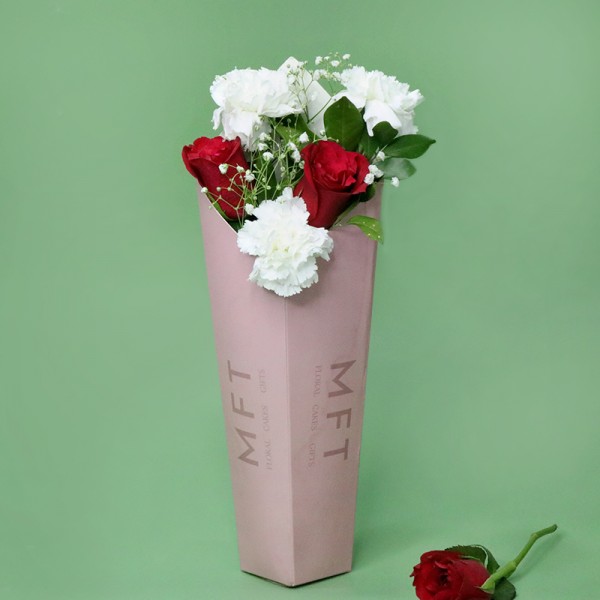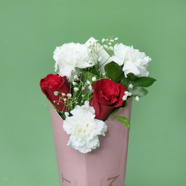 Our Red Carnation & White Rose Sleeve Arrangement brings together the beauty of passionate red carnations and the purity of white roses, all elegantly arranged in a modern handpouch. This stunning combination makes it a perfect gift for expressing love, respect, and admiration. The rich red carnations symbolize deep love, while the white roses convey purity and innocence, making this arrangement a heartfelt choice for any occasion.Whether you're celebrating an anniversary, birthday, or simply sending a thoughtful gift, this Handpouch with Red Carnations & White Roses is sure to leave a lasting impression. Order today and give the gift of fresh flowers in a sleek, stylish handpouch.