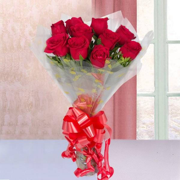Let someone know how much you adore them with this sweet and simple token of love. This Bunch of 10 beautiful Red Roses, wrapped in cellophane paper, is enough to say that one is adored.