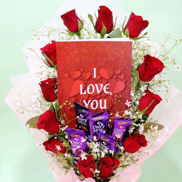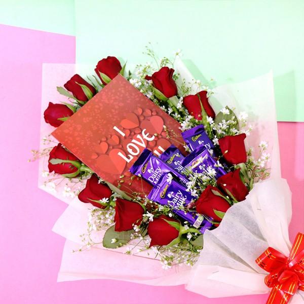 What could be better than flowers and chocolates in one bouquet? An instant mood lifter—passionate red roses wrapped in elegance paired with rich chocolates—a win-win situation!