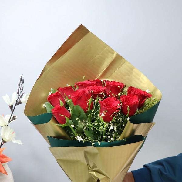 Redefine love with this luxurious Roses in Gold bunch. Highly charming bunch, made with a Dozen Roses, wrapped in a Golden Wrapping paper and tied with a beautiful ribbon bow paper to give it a sense of luxury and pride. A perfect gift to show that you are proud of your love.