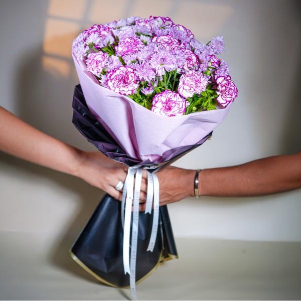 A charming bouquet featuring elegant purple carnations and cheerful purple daisies, symbolizing admiration, gratitude, and joy. This vibrant floral arrangement beautifully blends soft romance with fresh energy, making it the perfect way to express heartfelt emotions. Ideal for birthdays, anniversaries, or just to brighten someone’s day, this thoughtfully crafted bouquet is a wonderful way to show you care on any special occasion."This version includes "birthday," "anniversary," and "special occasion," highlighting its versatility for a range of celebrations while emphasizing the symbolic meaning of the flowers.
