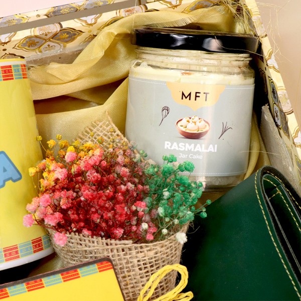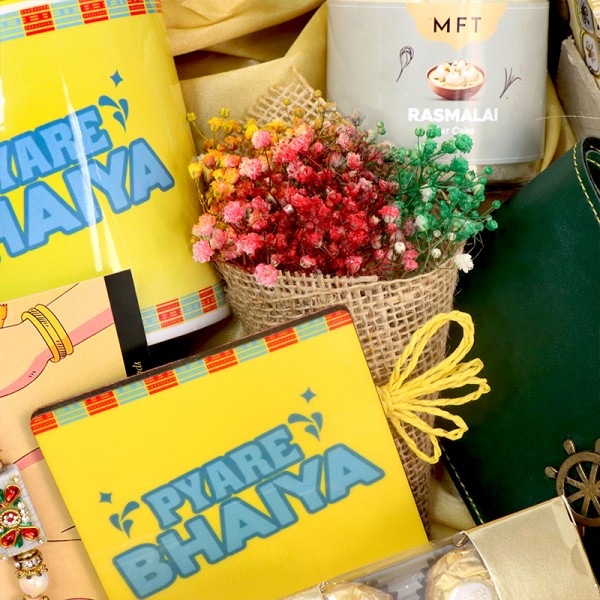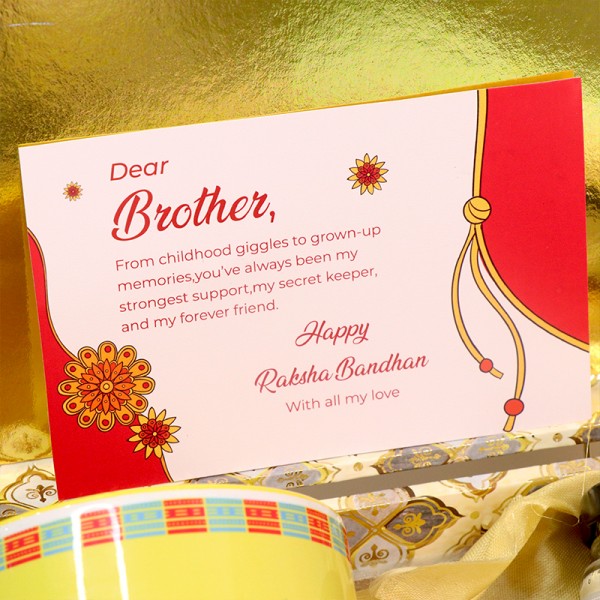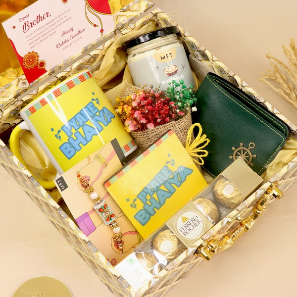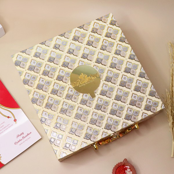 Gift a moment of pure luxury this Raksha Bandhan with our thoughtfully curated hamper. Featuring a premium rakhi, a selection of artisanal treats, and elegant packaging, this stylish gift is a sophisticated way to celebrate the bond with your dear brother or sister.Perfect for expressing your love and appreciation on this special occasion, this hamper combines tradition with modern elegance to make Raksha Bandhan truly memorable.