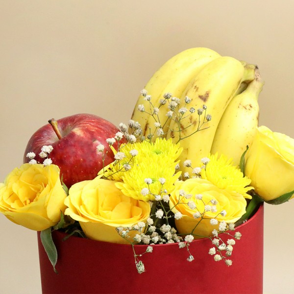 Brighten any celebration with this elegant floral and fruit arrangement, thoughtfully curated for joyful gifting. Featuring 1 stick of cheerful yellow daisies and 5 fresh yellow roses, this arrangement radiates warmth, positivity, and friendship. Paired with up to 1 kg of premium fruits, including crisp apples and ripe bananas, it offers a perfect balance of beauty and wellness. All elements are beautifully presented in an exclusive MFT Signature Round Red Box, adding a touch of luxury. Ideal for birthdays, get well wishes, anniversaries, or congratulations, this vibrant gift delivers freshness, elegance, and heartfelt emotions in one memorable package everywhere worldwide.