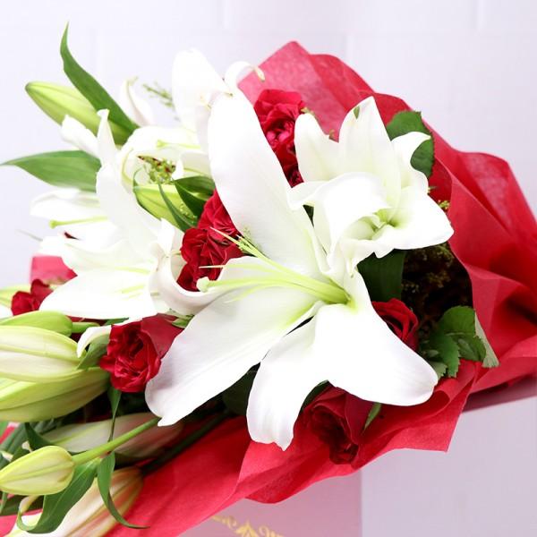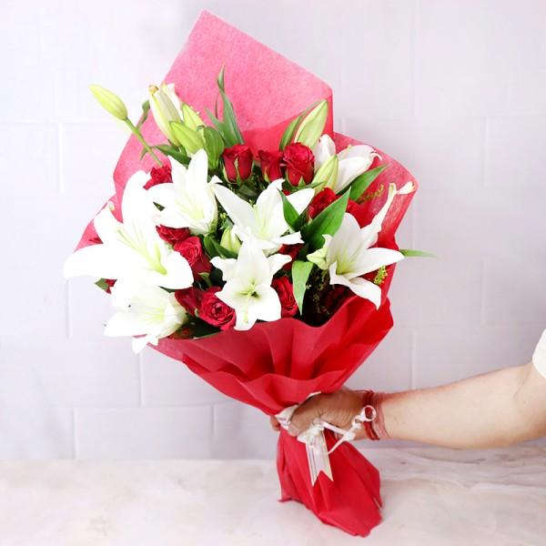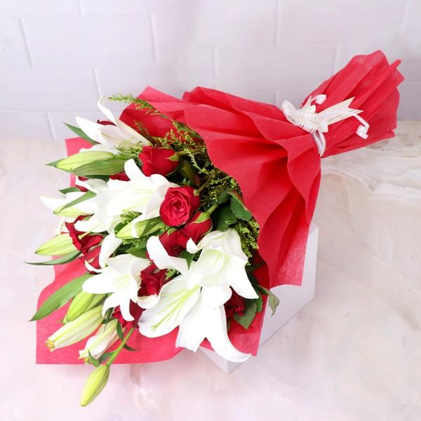 This gorgeous bunch that is made using 4 Oriental White Lilies and 12 Red Roses is a real treat for the eyes. Made with two most beautiful colours, Red and White, this bunch speaks perfection!