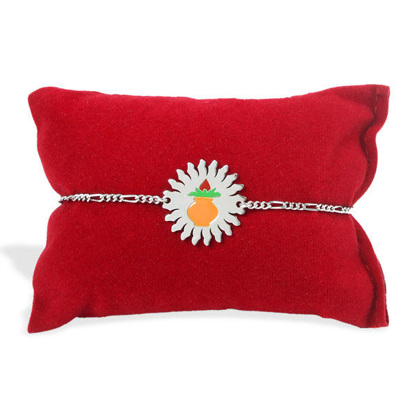 May the special bond of love you share with your brother be eternal as you tie this floral Kalash chain rakhi on his wrist. Exquisitely crafted from 925 sterling silver, this rakhi which also comes with roli chawal is sure to make the occasion extra special for him. Please note that the cushion shown in the image is for display purpose only.