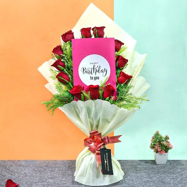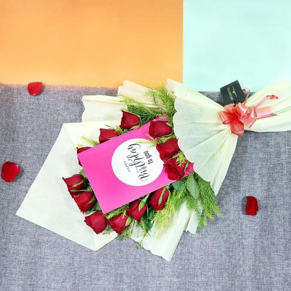 Deliberate your love with this 12 red roses bouquet to capture the heart of loved ones. Wish them whole heartedly with happy birthday greeting card to shower your love.