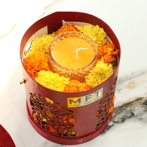 Invite happiness and prosperity into your home with our Marigold Blissful Bloom arrangements. These exquisite marigold flower creations are the ideal centerpiece for Diwali, special events, and any occasion that celebrates life and light