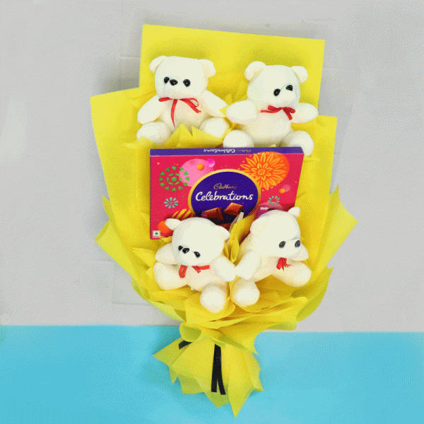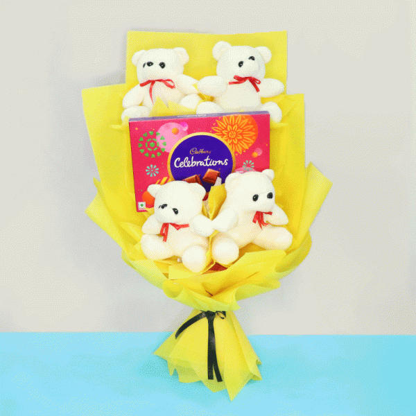 - 4 Teddy Bear (6inches) with One Cadbury Celebration Pack (125 Gm) arrangement in a Bouquet