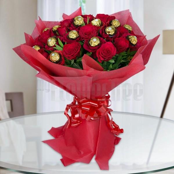 Chocolates and Flowers make a good couple. That is why we have curated this perfect bunch for you that has 16 Red Roses and 16 Ferrero Rocher Chocolates tied together in Red Paper Packing. Happy gifting.