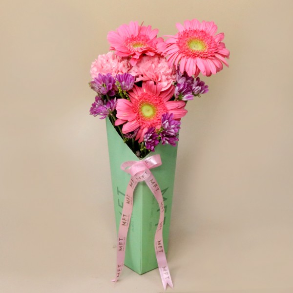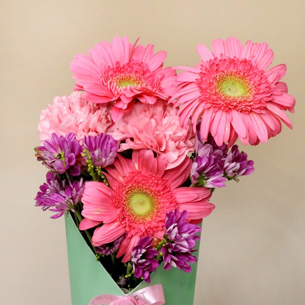 Product Contains: - Green Sleeve Arrangement of Pink Gerberas,Pink Carnation and Purple Daisy